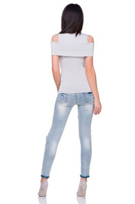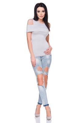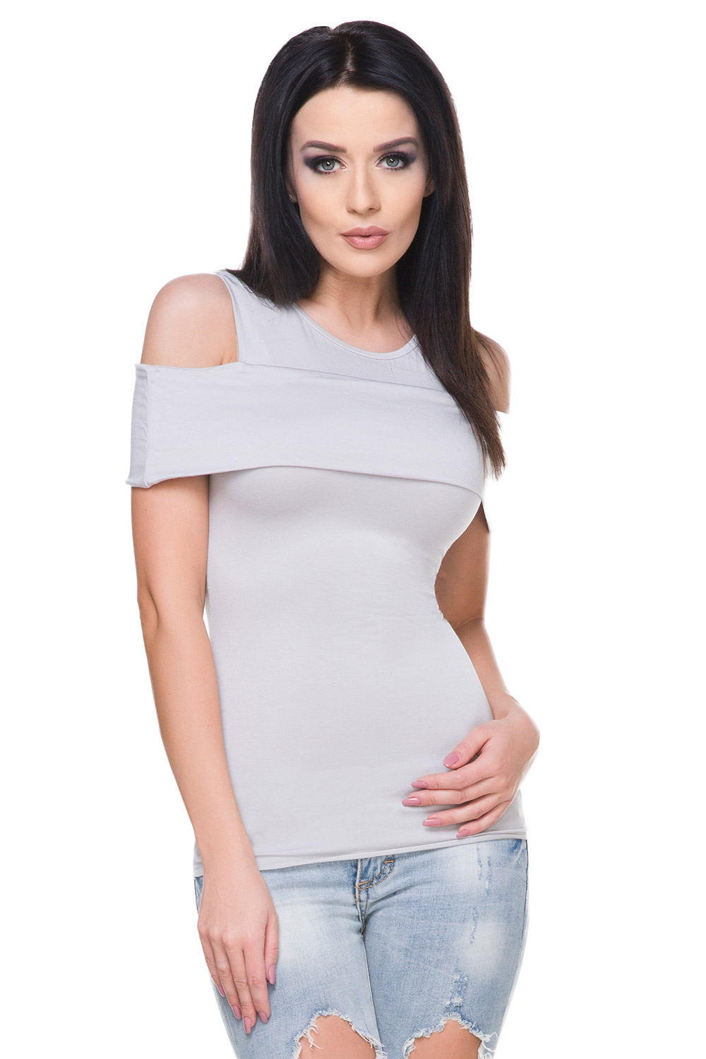 Bluzka z delikatnej dzianiny. Podkroje pach oraz dekolt wykończone ściągaczem. Dół pozostawiony w stanie surowym.