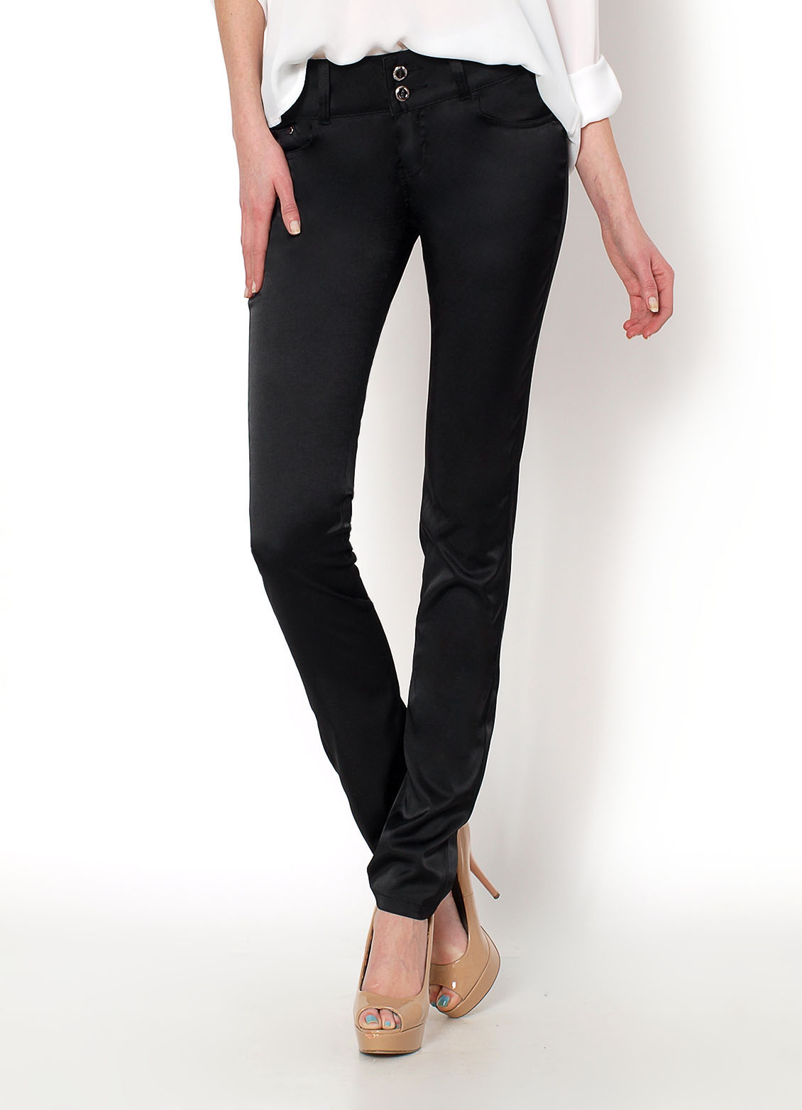 Spodnie materiałowe, klasyczny fason -rurki, lekko zwężana nogawka, półmatowy materiał, kieszenie z przodu i z tyłu, zapinane na zamek i dwa guziki, w pasie szlufki.